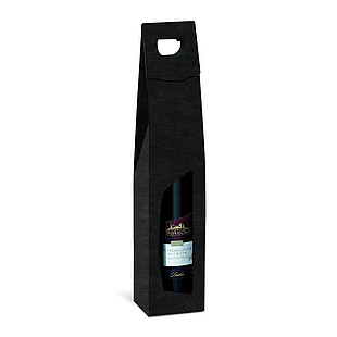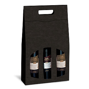 Carrying box with textured surface for wine and champagne bottles, coloured black inside, with extra-long viewing windows and carrying handle.