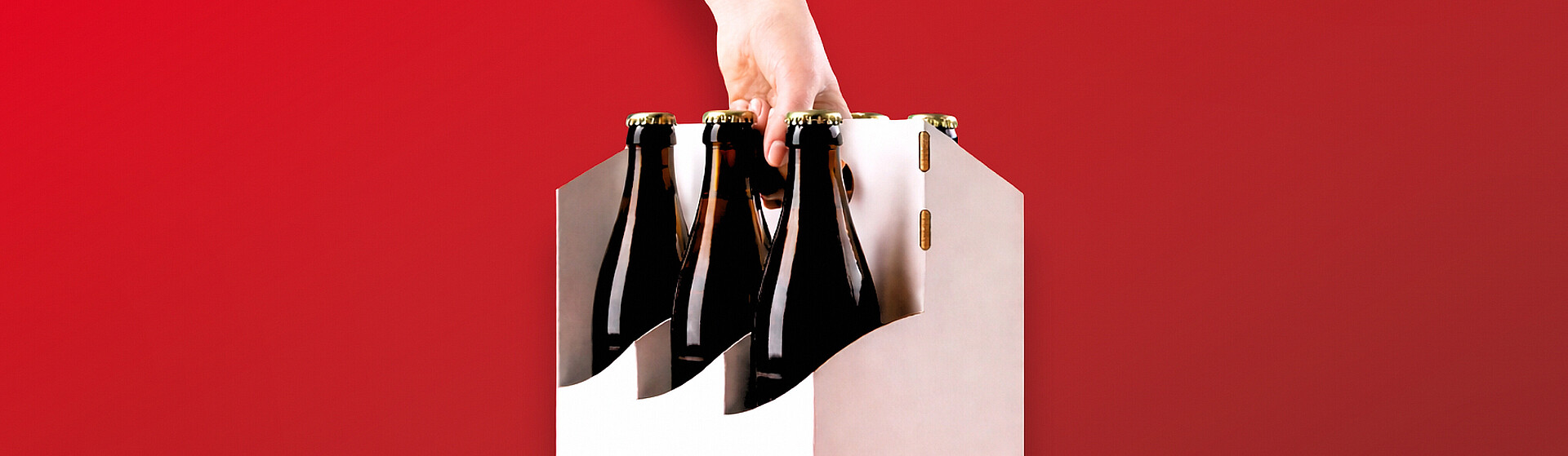 A highly reduced type of bottle packaging: we provide cardboard bottle clips in various configurations - with and without handles, for standard bottles or special designs, for PET bottles and for glass bottles with swing tops.