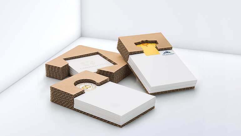 We also offer our popular adhesive products with special structural designs. Whatever you would like in terms of materials, finishes, shapes, sizes and numbers of sheets – almost anything can be created. Product imitations or effect envelopes are particularly effective, for example. Various adhesive products such as adhesive notes and adhesive markers can also be combined with the likes of note pads.